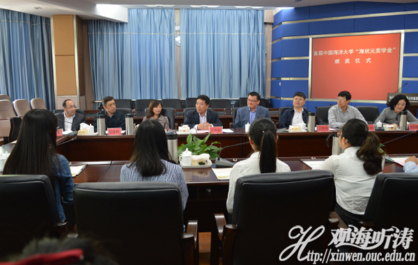 本站讯 5月18日上午,首届中国海洋大学“海状元奖学金”颁奖仪式在鱼山校区文苑楼多功能厅举行。中国海洋大学总会计师王剑敏、海大生物集团有限公司董事长单俊伟,以及相关单位负责人和获奖学生出席了颁奖仪式。