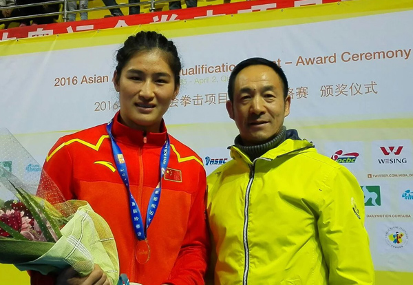 中国海洋大学拳击队总教练于联志教授(右)与李倩合影【摄于2016年亚洲和大洋洲里约奥运会拳击资格赛期间】
