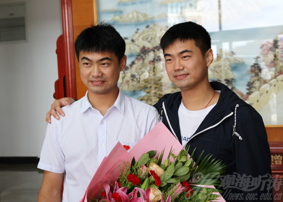 中国海洋大学党委副书记、副校长陈锐(左)代表学校为路越颁发5000元慰问金