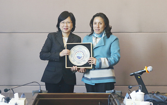 闫菊副校长(右)代表学校向黎陈芷娟秘书长赠送纪念品