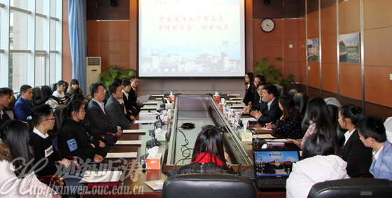 教育基金会秘书长陈忠红主持颁奖仪式,学生工作处副处长黄立田宣读了《关于颁发中国海洋大学第三届“鲁信奖学金”的决定》。信息科学与工程学院蔡云翔等20名优秀本科生获奖,新闻学专业2013级潘丽容代表获奖学生发言。