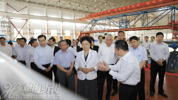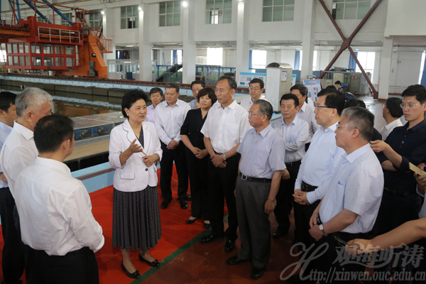本站讯 6月5日下午,中共中央政治局委员、国务院副总理刘延东来到中国海洋大学视察指导工作。刘延东实地考察了山东省海洋工程重点实验室,并与参加中国海洋大学第八届大学生创新创业论坛的师生亲切交流。科技部党组书记、副部长王志刚,省委书记、省人大常委会主任刘家义,国务院副秘书长江小涓,教育部副部长杜占元,省委常委、市委书记张江汀,市委副书记、市长孟凡利等参加调研。