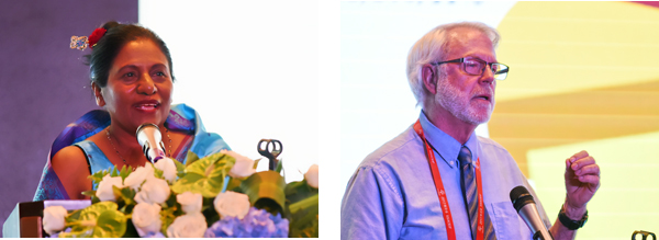 斯里兰卡驻中国大使馆公使Shani Calyaneratne Karunaratne女士(左)介绍了斯里兰卡在海洋资源利用与保护等相关领域的政策与做法,美国SCRIPPS研究所Gerwick教授针对海洋天然药物发现支持生物多样性保护阐述观点