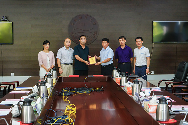 王剑敏总会计师代表学校向郭程董事长赠送纪念牌