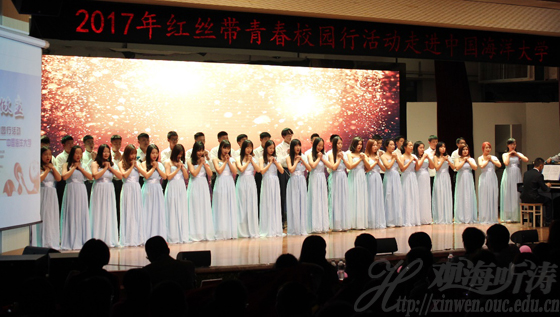 本站讯 10月11日,“美好青春我做主”——红丝带青春校园行活动走进中国海洋大学崂山校区。活动现场通过主题访谈、互动问答以及文艺表演等方式,为学生们上了一堂有趣生动的防艾公开课。
