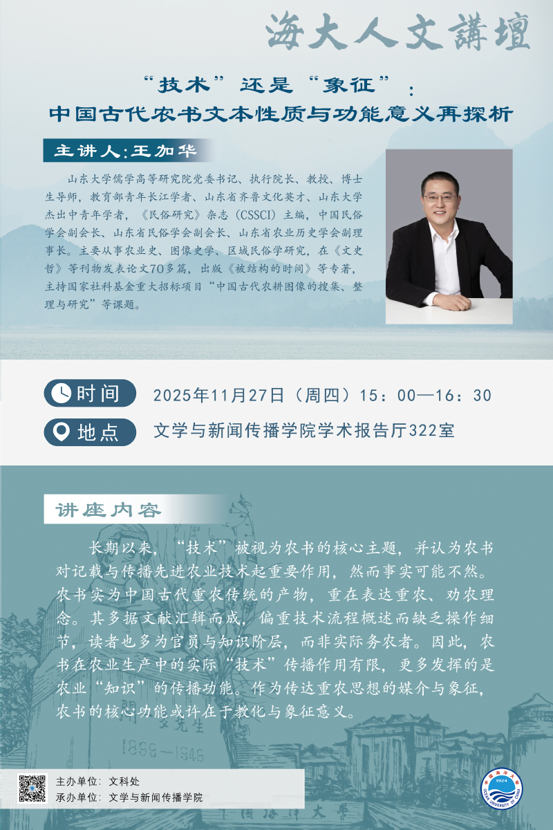 海大人文讲坛2025年第92讲-王加华:“技术”还是“象征”:中国古代农书文本性质与功能意义再探析