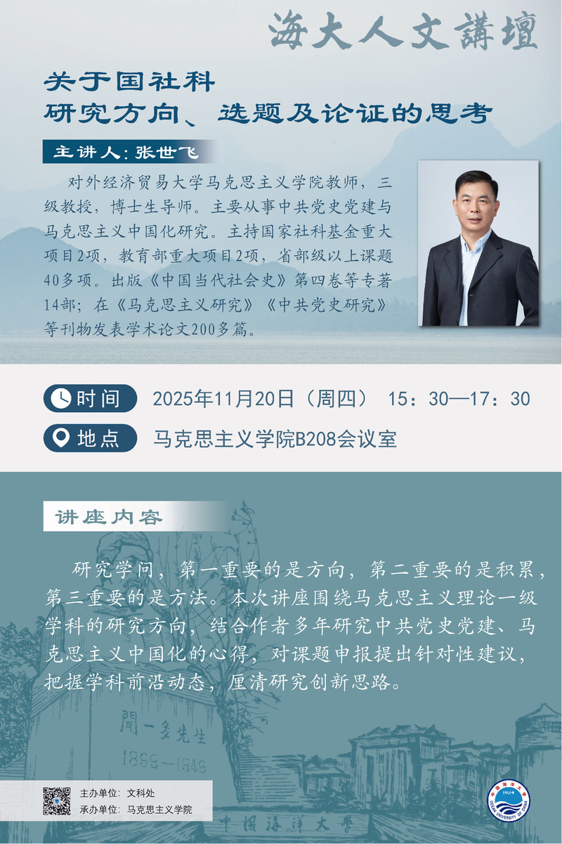 海大人文讲坛2025年第86讲-张世飞:关于国社科研究方向、选题及论证的思考