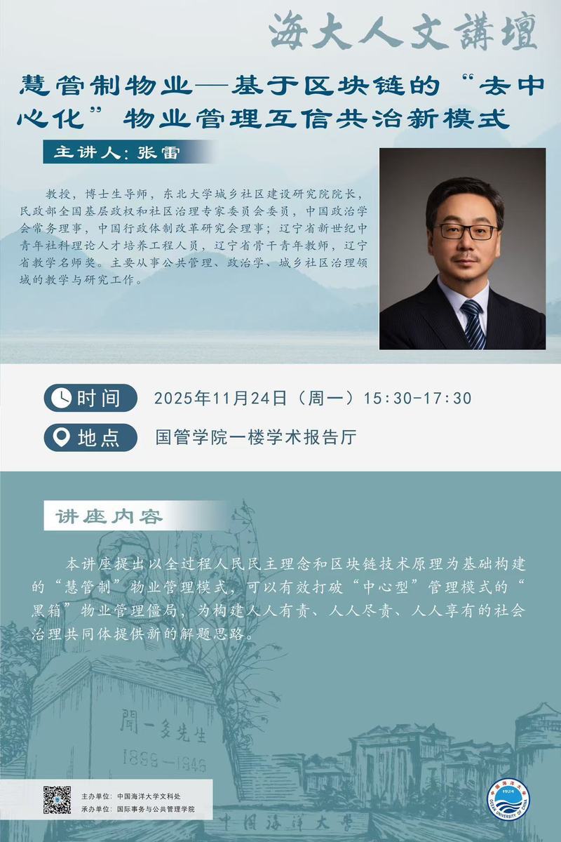 海大人文讲坛2025年第90讲-张雷:慧管制物业——基于区块链的“去中心化”物业管理互信共治新模式