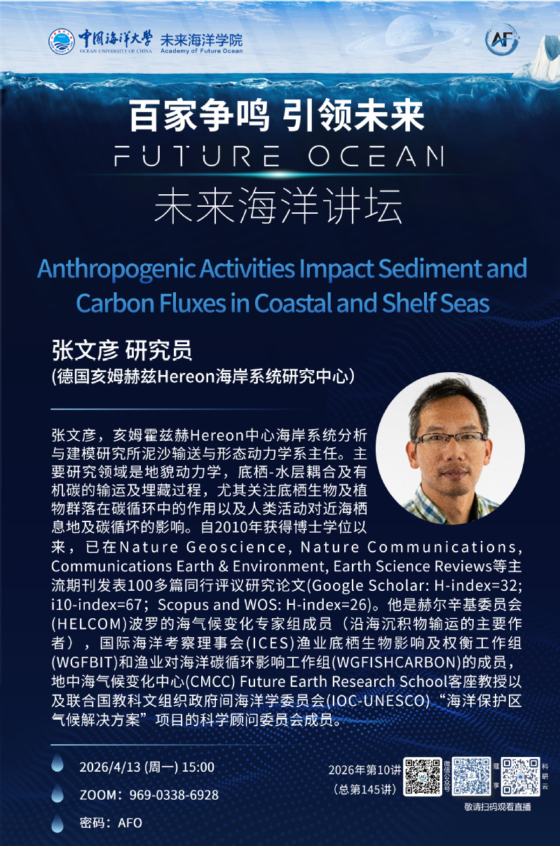 未来海洋讲坛第145讲(2026年第10讲)-张文彦:Anthropogenic Activities Impact Sediment and Carbon Fluxes in Coastal and Shelf Seas 发布者:管理员发布时间:2026-04-09浏览次数:46