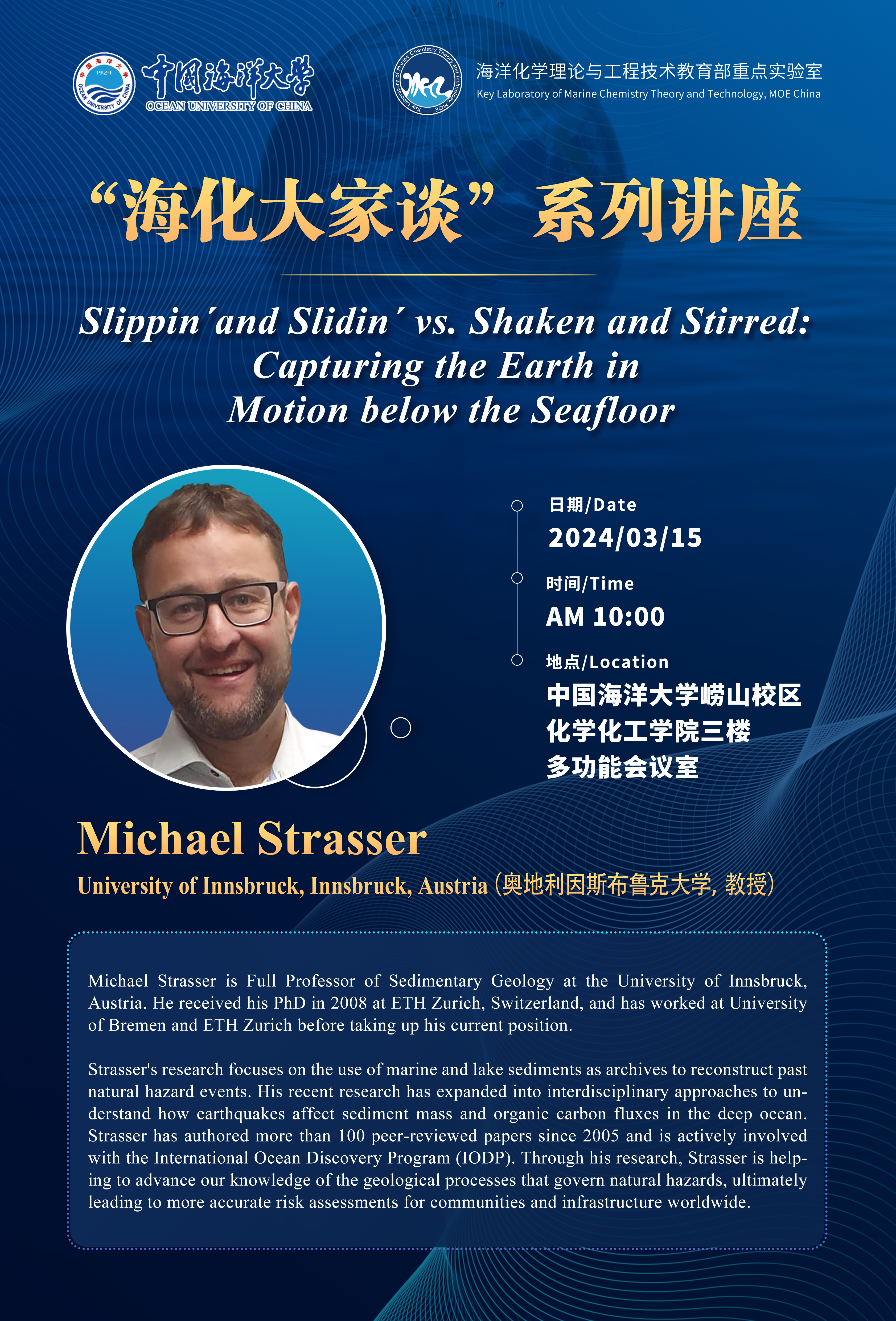 “海化大家谈”系列讲座第1讲(2024年第1讲)-Michael Strasser:Slippin´and Slidin´ vs. Shaken and Stirred:Capturing the Earth in Motion below the Seafloor