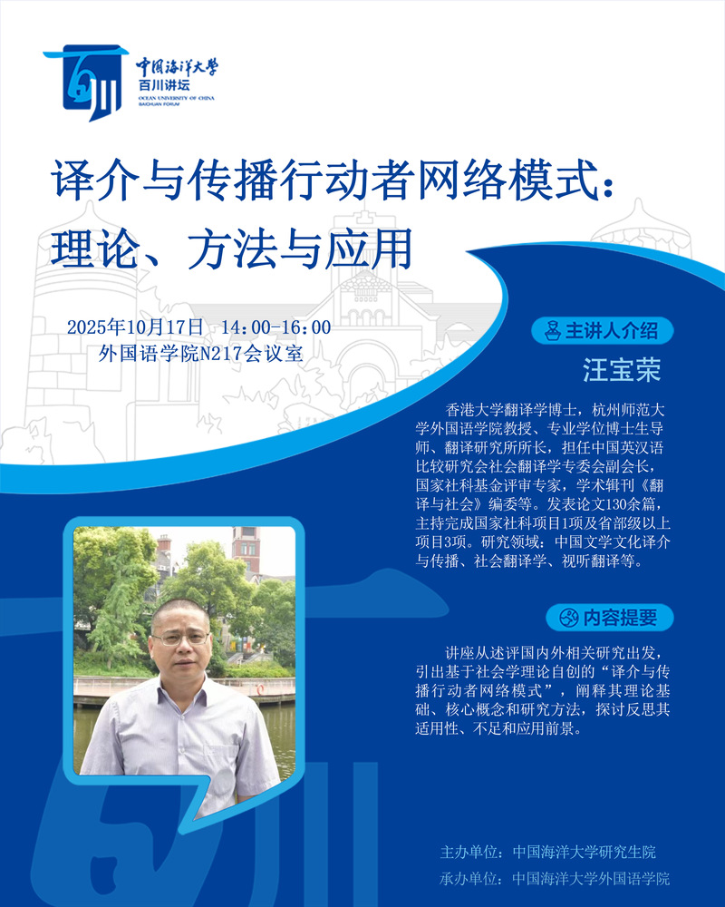 研究生百川讲坛第533讲-汪宝荣:译介与传播行动者网络模式:理论、方法与应用