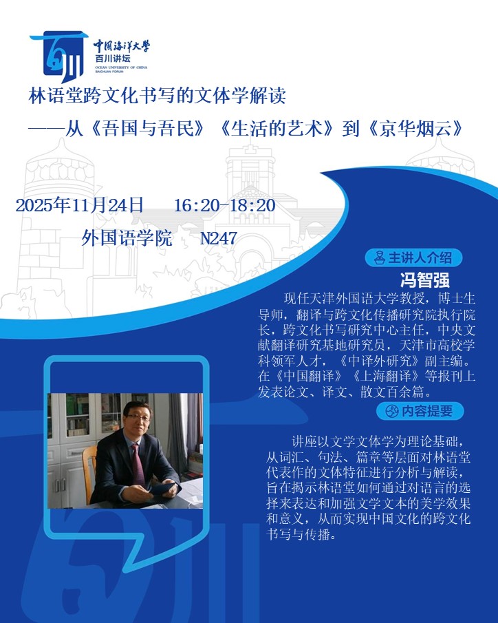 研究生百川讲坛第567讲-冯智强:林语堂跨文化书写的文体学解读—从《吾国与吾民》《生活的艺术》到《京华烟云》