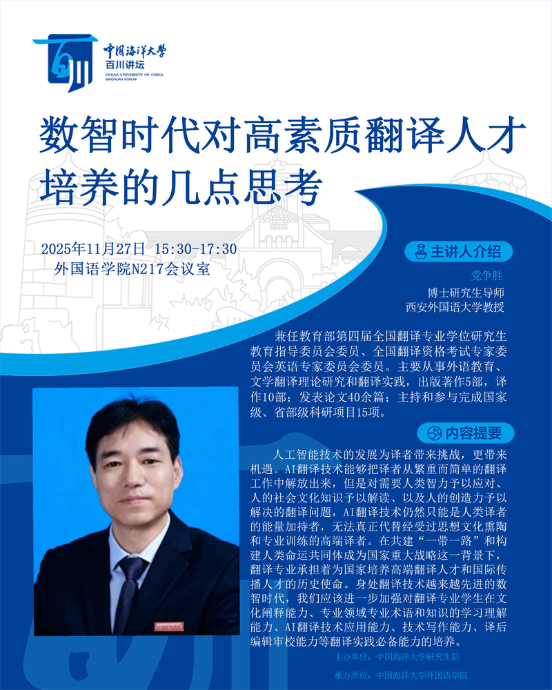 研究生百川讲坛第570讲-党争胜:数智时代对高素质翻译人才培养的几点思考