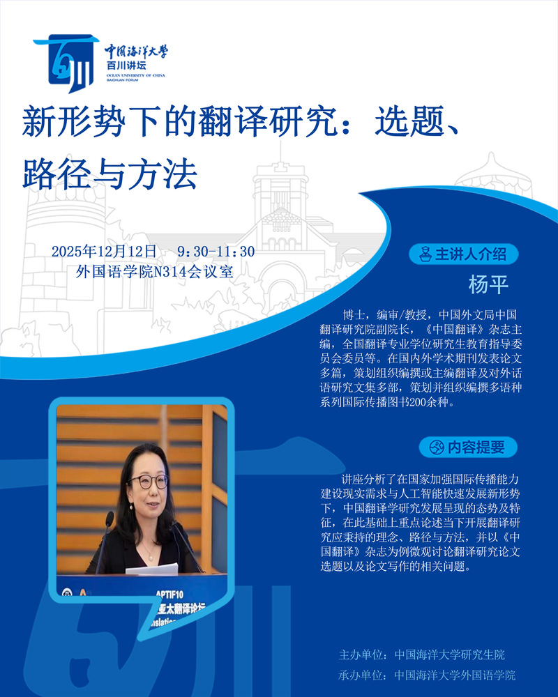 研究生百川讲坛第581讲-杨平:新形势下的翻译研究:选题、路径与方法