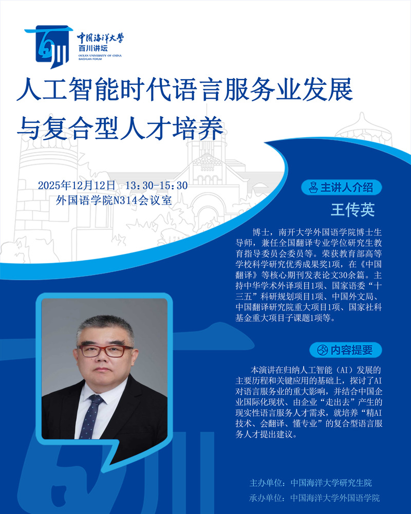 研究生百川讲坛第583讲-王传英:人工智能时代语言服务业发展与复合型人才培养