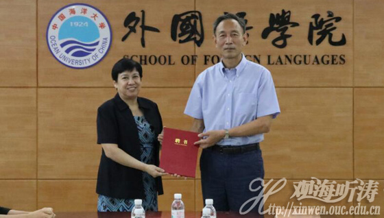 鞠传进书记(右)为金莉教授颁发聘书 本站讯 8月29日下午,中国海洋大学在外国语学院举行兼职教授聘