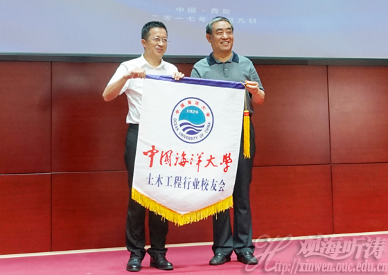 吴德星会长(右)向分会授旗,薛军会长代表分会接旗 本站讯 9月9日,中国海洋大学土木工程行业校友分