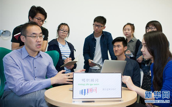 创业导师薛艺(左一)为大学生创业团队进行指导(新华社记者 陈君清 摄) 本站讯 5月12日晚,《创