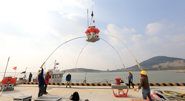 工作人员将海底电磁采集站运往船上 本站讯 近日,在青岛国家深海基