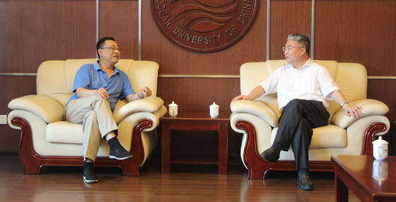 于志刚校长(右)与杨绥华社长交谈 本站讯 7月9日上午,海洋出版社社长杨绥华、副总编辑刘勃等一行三
