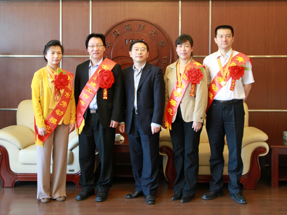 党委书记孙也刚(中)会见学校2015年全国先进工作者吴立新院士(左二)及市劳动模范方奇志教授(右二)