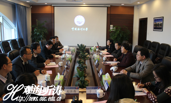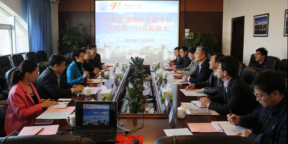 本站讯 11月26日上午,潍坊市副市长王桂英一行7人到中国海洋大学调研合作办学事宜,校长于志刚、