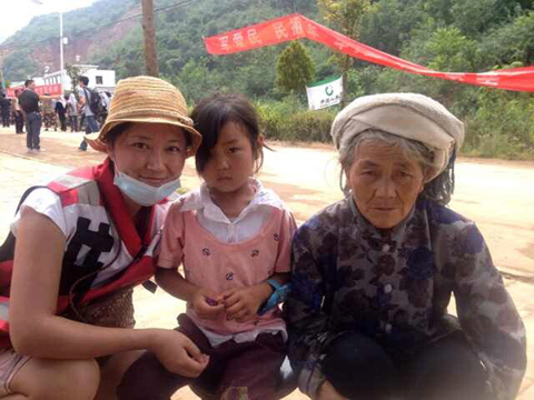 于媛颖(左一)在灾民安置点发现了一个小女孩,她在地震中擦伤了脚