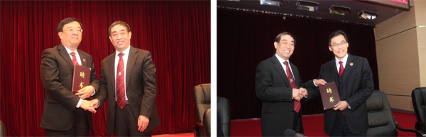 吴德星校长为祝华院长(左)、董以志检察长(右)颁发兼职教授聘书