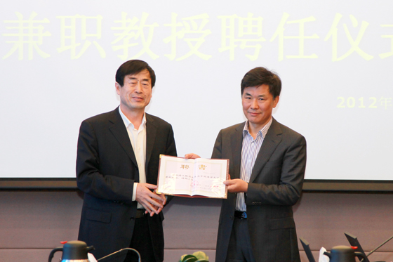 于宜法副校长(左)向王殿昌司长(右)颁发聘书 本站讯&