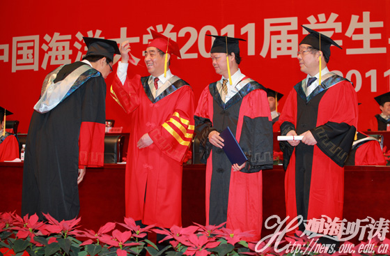 吴德星校长(左)、麦康森院士(中)、董双林副校长(右)为毕业生授予学位 &nb