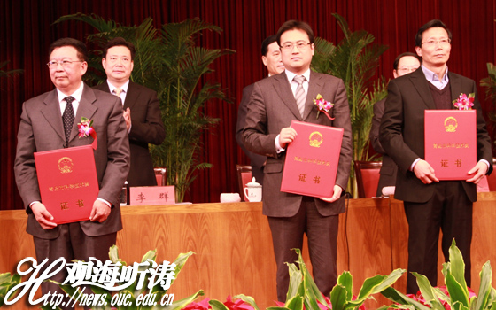 自然科学一等奖获得者张浩教授(中)上台领奖 本站讯 2011年3
