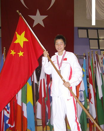 获奖后,董程同学在赛场展示国旗 本站讯 记者日前从国家体育总局获