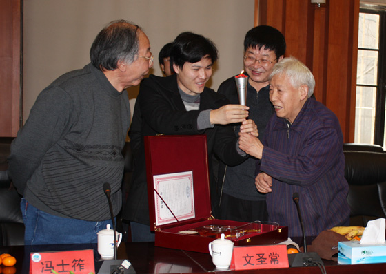 黄麟英副厅长(右二)看望海大院士,图为省有关部门领导向文圣常院士(右一)、冯士筰院士(左一)等赠送纪