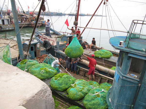 沙子口渔港码头打捞上的浒苔 本站讯 中国海洋大学海大生物工程公司