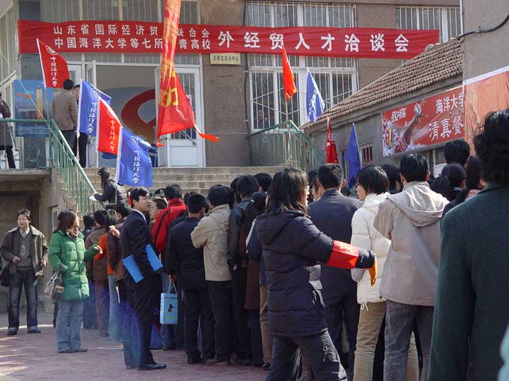 会场门外人头攒动 本站讯 2005年3月6日,山东省国际经济贸易联合会与驻青7所大专院校在我校