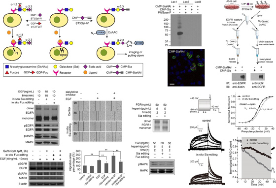 本站讯2018年1月2日,国际知名期刊《德国应用化学》(AngewandteChemieInternationalEdition)在线发表了中国海洋大学医药学院于广利课题组蒋昊副教授的最新研究成果“ModulatingCell-SurfaceReceptorSignalingandIonChannelFunctionsbyInSituGlycanEditing”(利用糖链原位编辑技术调控细胞表面受体蛋白和离子通道功能)。细胞表面的信号通路受体蛋白含有不同程度的糖基化修饰,受体蛋白的糖基化与“受体-配体”结合、受体成簇、内化和降解密切相关,并在调节受体激活中扮演重要角色。因此,通过改变细胞表面受体蛋白糖链的组成可以达到调节相关信号通路目的。目前对细胞糖链进行编辑的基因操作法与代谢法均会对细胞代谢状态产生长时干扰,因此,急需开发对细胞代谢干扰小的糖链编辑新方法。蒋昊副教授与美国斯克利普斯研究所PengWu教授课题组合作,开发了一种利用外源糖基转移酶对细胞表面进行原位糖链编辑(insituglycanediting)新方法。在利用生物正交反应(CuAAC)确认了原位糖链编辑在细胞表面和特定蛋