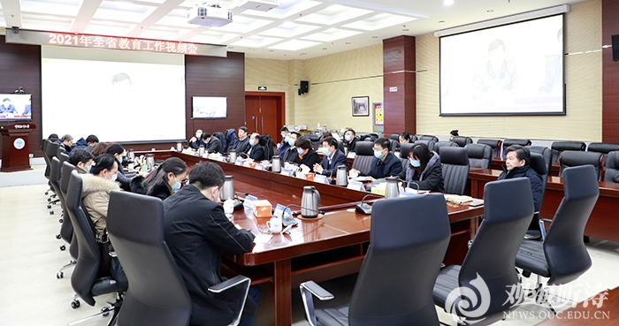 本站讯1月14日,2021年全省教育工作视频会议召开,传达全国2021年教育工作会议精神,盘点“十三五”时期和2020年我省教育主要工作,分析当前形势任务,对2021年的教育工作作出部署安排。省委教育工委常务副书记、省教育厅党组书记、厅长邓云锋出席会议并讲话。中国海洋大学设立分会场。学校党政领导田辉、张静、李巍然、王剑敏、卢光志、杨茂椿,校长助理于利,有关单位负责人收看了视频会议。 会议全面总结回顾“十三五”时期特别是2020年工作,指出“十三五”时期是我省教育面貌发生格局性变化的五年,党对教育的领导全面加强,教育综合实力大幅跃升,教育发展质量显著提高,教育民生福祉持续增进,教育条件保障全面改善。2020年是极不平凡的一年,面对世界百年未有之大变局和百年不遇的新冠肺炎疫情影响,全省教育系统深入贯彻习近平总书记关于统筹疫情防控和经济社会发展的重要讲话精神,认真落实党中央决策部署和省委省政府工作要求,围绕立德树人根本任务,聚力科教改革攻坚,着力推进教育事业发展,经受住了世纪疫情考验,交出了一份优异答卷,全省教育系统疫情防控取得重大战略成果,党建基层基础更加稳固坚实,德智体美劳全面培养体系
