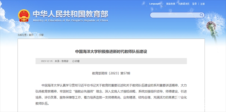 • 【编者按】2023年12月15日,教育部简报〔2023〕第57期以《中国海洋大学积极推进新时代教师队伍建设》为题,专题报道了学校认真学习贯彻习近平总书记关于教育的重要论述和关于教师队伍建设的系列重要讲话精神,大力弘扬教育家精神,深入实施人才强校战略,通过强化党的领导、强化师德建设、强化引育并举、强化评价改革和强化激励保障等有力举措,打造高素质专业化教师队伍的创新做法与实践经验。  教育部简报由教育部办公厅组织编发,是教育部传达信息的重要形式。简报分送中共中央办公厅、全国人大常委会办公厅、国务院办公厅、全国政协办公厅;中央教育工作领导小组成员,中央和国家机关有关部委,全国人大教科文卫委员会,全国政协教科卫体委员会,各民主党派中央,有关人民团体;各省、自治区、直辖市党委、人民政府,新疆生产建设兵团等。简报全文如下:中国海洋大学认真学习贯彻习近平总书记关于教育的重要论述和关于教师队伍建设的系列重要讲话精神,大力弘扬教育家精神,牢固树立“强教必先强师”理念,深入实施人才强校战略,系统加强组织领导、师德建设、引进培养、评价改革、服务保障等工作,着力培养造就一支师德高尚、业务精湛、结构合理、充满活
