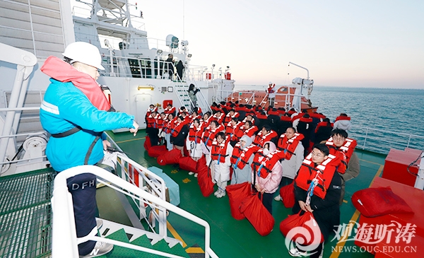 •   本站讯 习近平总书记在考察中国海洋大学三亚海洋研究院时强调,建设海洋强国是实现中华民族伟大复兴的重大战略任务。为进一步增强师生“关心海洋、认识海洋、经略海洋”的意识与情怀,培育更多矢志深蓝的创新性人才,12月17日至20日,中国海洋大学公共选修课《海洋科考认知实践》在“东方红3”船上继续开讲,课程面向高校和科研院所师生开放共享,来自中国海洋大学、山东大学、西安电子科技大学、中国石油大学(华东)、中国科学院青岛生物能源与过程研究所、青岛大学、山东科技大学、青岛科技大学等高校和科研院所的140余名师生登船学习。  师生们观看宣传片,参观驾驶室、生活区和实验作业区,深入了解“东方红3”船,领略全球最大的最高静音等级科考实习船的风采。“东方红3”船实验室老师讲授了海洋水文、海洋气象、海洋生物、海洋化学、海洋地质等海洋调查方面以及船载先进海洋调查仪器设备的相关知识,带领师生们现场观摩CTD(Conductance Temperature Depth,温盐深测量仪)探测与样品采集全过程,学习逃生技能并开展弃船求生演习。课程坚持思想价值引领,每个航次均融入“海洋强国与伟大复兴”系列思政内容,师生