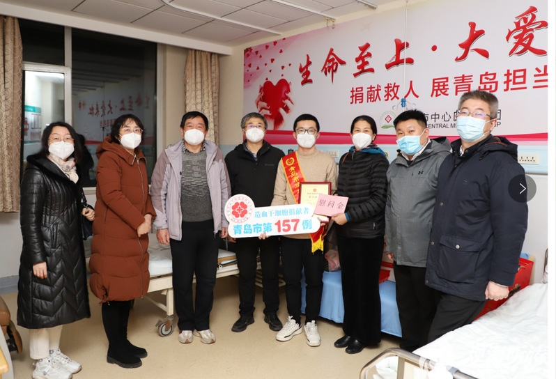 • 本站讯1月12日下午,中国海洋大学化学化工学院团委书记、辅导员吕朋在青岛市中心医院完成造血干细胞采集捐献,为一位血液病患者带去生的希望。本次捐献历时六天,在1月11日下午完成250毫升造血干细胞混悬液捐献出院后,由于受捐者的特殊情况,吕朋于12日上午再次前往医院进行第二次采集,完成135毫升造血干细胞悬液的捐献。期间,学校副校长刘勇一行到医院看望慰问吕朋。据悉,吕朋是青岛市第157例、崂山区第17例、学校教工第2例造血干细胞捐献者,也是青岛市2023年捐献造血干细胞的第一个志愿者。刘勇询问了解了吕朋的身体恢复情况,对其捐献造血干细胞的志愿行为给予高度赞许,并代表学校颁发了慰问金。他表示,吕朋热心公益、无私奉献的博爱精神展现了海大人的博大胸怀,体现了青年人的责任和担当,值得广大师生学习。刘勇(左一)一行询问吕朋(左二)身体恢复情况崂山区红十字会副会长王鲁青向吕朋和中国海洋大学表示感谢和敬意。他介绍,当得知造血干细胞配型成功时,吕朋没有丝毫犹豫,在整个捐献过程中积极配合,坚定且勇敢,用个人奉献生动诠释了“人道、博爱、奉献”的红十字精神。 2023年1月11日,对吕朋来说具有双重意义。一是捐