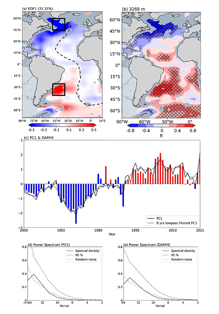 • 本站讯近日,中国海洋大学深海圈层与地球系统前沿科学中心/物理海洋教育部重点实验室/未来海洋学院李建平教授团队在深海大尺度自然变率研究领域取得突破进展,首次发现大西洋深海海温场主导变率模态,并构建其和大西洋经向翻转环流间的物理关联。研究成果以“Deep Atlantic Multidecadal Variability”(《大西洋深海多年代际变率》)为题,发表于国际知名学术期刊Geophysical Research Letters(《地球物理研究通讯》)。深海科学是21世纪世界科技发展的重要前沿和关注重点,在不久的未来,深海将成为全球资源争夺的新赛道、军事发展的战略新领域。在全球变暖背景下,深海凭借巨大的储热能力,被视作地球气候系统的重要缓冲器。作为全球热盐环流的重要组成部分,大西洋经向翻转环流是连结大西洋表层海洋和深层海洋的关键动力因子,因此对大西洋深海环流的认识有可能是深海科学发展的突破口。而海温是连结热力学和动力学的基本物理参量,深海海温的时空变化特征是深海科学相关分支研究的基础,但是大西洋深海海温场主导模态却鲜有研究。大西洋深海海温场的主导模态是否存在,其基本特征是怎样?这是个