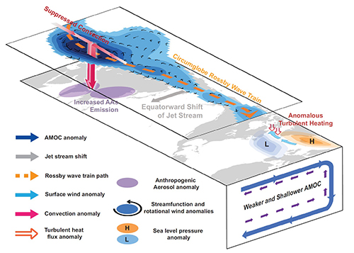 • 本站讯近日,中国海洋大学海洋与大气学院和深海圈层与地球系统前沿科学中心刘福凯副教授和罗义勇教授联合国内外学者在大洋环流与气候变化研究领域取得重要进展,首次揭示了亚洲区域人为气溶胶排放增加能够显著减弱大西洋经向翻转环流(AMOC),并深入解析了其中的遥相关过程和对北大西洋深层水生成过程的影响。相关成果以“Increased Asian aerosols drive a slowdown of Atlantic Meridional Overturning Circulation”(亚洲气溶胶排放的增加导致了大西洋经向翻转环流的减速)为题,发表于国际知名学术期刊Nature Communications。AMOC是全球气候系统重要的物质和能量输送带,其演变对区域和全球气候有重要的调控作用。研究表明,AMOC在最近四十年呈现出明显的减弱趋势,通常被认为是温室气体增加以及欧美地区人为气溶胶减少的结果。然而亚洲地区人为气溶胶排放的持续增加这一外强迫对AMOC的影响尚未明确。通过开展全耦合模式数值试验,本研究发现与北大西洋相距甚远的亚洲气溶胶排放增加能够促成AMOC的减弱,比欧美地区气溶胶减少带来