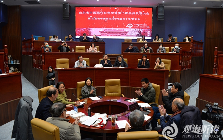 • 本站讯2023年12月16日至17日,山东省中国现代文学学会第十次会员代表大会暨“山东省中国现代文学学会40年”学术研讨会在济南召开。中国现代文学研究会副会长、山东省中国现代文学学会会长魏建教授主持大会。山东省社科联向大会发来贺信。  本次会议由山东省中国现代文学学会、山东师范大学文学院主办。来自山东大学、中国海洋大学、山东师范大学、青岛大学、曲阜师范大学等20多所高校的近百名专家学者参加。会议听取和审议了山东省中国现代文学学会第九届理事会工作报告,选举产生了新一届理事会、监事会。中国海洋大学文学与新闻传播学院朱自强教授当选为副监事长、温奉桥教授当选为副会长,邱焕星、于慈江教授分别当选为常务理事、理事。  会议围绕山东省中国现代文学研究、学会四十年的历史、中国现代文学教学等有关问题进行了学术研讨。温奉桥、邱焕星、于慈江分别做了大会发言。  中国海洋大学文学与新闻传播学院设有中国语言文学一级学科博士点、硕士点,中国现当代文学学科是山东省重点学科,经过多年建设,形成了一个特色鲜明、结构合理的研究队伍,为推动学校人文学科发展做出了重要贡献。参会人员合影