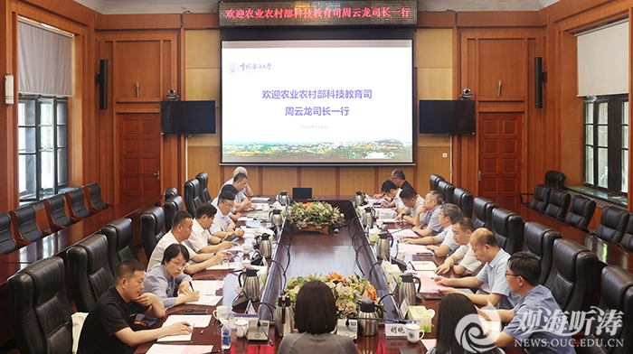 • 本站讯 8月8日,农业农村部科技教育司司长周云龙一行到中国海洋大学进行调研交流,中国工程院院士万建民、山东省农业农村厅二级巡视员姜卫良、青岛市农业农村局副局级领导干部徐振锋等参加调研,中国工程院院士包振民,党委常委、副校长刘勇出席调研座谈会。  刘勇对周云龙一行来访表示欢迎,并对农业农村部一直以来给予学校的支持表达感谢。他指出,学校将充分发挥水产国家战略科技力量主力军作用,聚焦水产种质创制、精准营养、健康养殖、高值化利用、水产品安全和深远海养殖等重大科学问题和技术瓶颈,进一步推动有组织科研,不断产出具有重大影响力、解决关键问题的成果,服务国家粮食安全和海洋强国建设。  周云龙全面了解学校学科布局、人才队伍、平台建设以及水产类相关学科研究进展,他对学校在人才培养、科学研究等领域取得的瞩目成绩给予了充分肯定,并希望学校切实发挥人才优势和综合学科优势,面向国家重大需求和经济主战场,超前谋划、精心部署,以科技创新支撑农业高质量发展。  包振民院士针对我国的滩涂、近岸浅海、深远海等水产养殖模式的未来发展方向分别提出意见建议。  学校科学技术处处长李岩主持调研座谈会。座谈会前,与会人员共同观看了