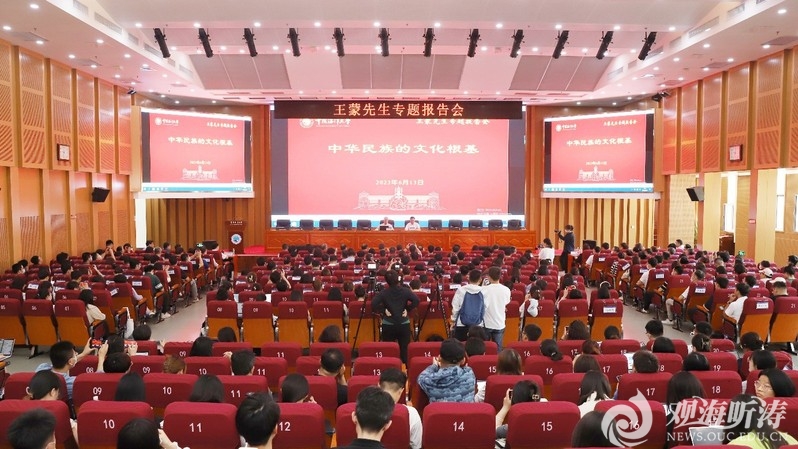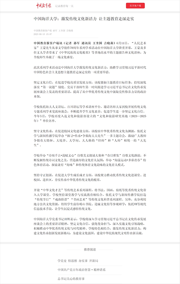 •   编者按2023年6月13日,《中国教育报》客户端报道《中国海洋大学:激发传统文化新活力 让主题教育走深走实》典型做法。文中指出,6月11日,“人民艺术家”王蒙先生从事文学创作70周年系列学术活动在中国海洋大学隆重开幕,王蒙及多位文人学者带来了《中华民族的文化根基》等多场高水平的主题报告和文化讲座,为全校师生奉献了一场文化盛宴。此次系列学术活动是学校激发传统文化新活力,助推学习贯彻习近平新时代中国特色社会主义思想主题教育走深走实的一项重要举措。党委书记田辉表示,学校将深入学习贯彻习近平总书记在文化传承发展座谈会上的重要讲话精神,坚定文化自信,强化使命担当,深入实施文化引领战略,积极推动中华优秀传统文化与时代精神、学校特色相结合,激发传统文化新活力,构建文化传承创新发展新格局,为建设文化强国、建设中华民族现代文明作出新贡献。全文如下:  中国教育报客户端讯(记者 孙军 通讯员 王奎国 吉晓莉)6月11日,“人民艺术家”王蒙先生从事文学创作70周年系列学术活动在中国海洋大学隆重开幕,王蒙及多位文人学者带来了《中华民族的文化根基》等多场高水平的主题报告和文化讲座,为全校师生奉献了一场文化盛