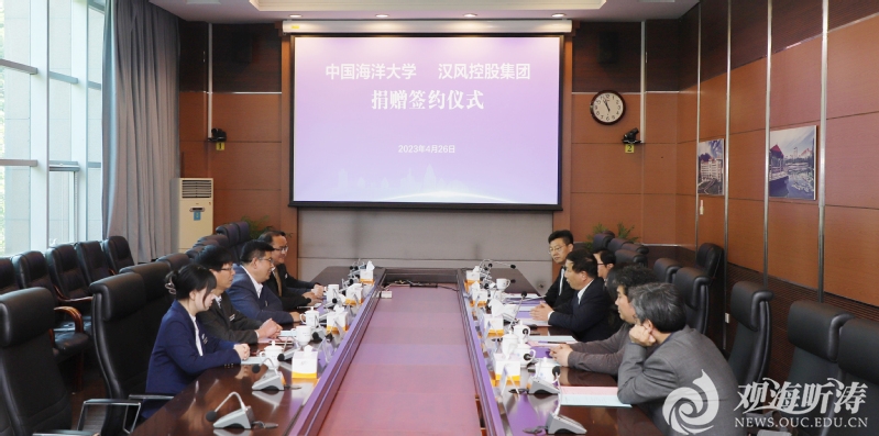 本站讯4月26日上午,中国海洋大学—山东汉风控股集团捐赠签约仪式在崂山校区举行。学校副校长、教育基金会理事长王剑敏, 山东汉风控股集团(以下简称“汉风集团”)董事长董聪政等出席捐赠仪式。根据捐赠协议,汉风集团将捐资支持学校艺术系的建设与发展。王剑敏简要介绍了学校建设发展情况,并对汉风集团的慷慨捐赠表示感谢。他讲到,汉风集团在教育、科技、智慧农业等领域快速发展的同时,热心公益事业,彰显了集团的责任和担当。基金会必将善款善用,落实好捐赠人的意愿,积极放大捐赠效益。学校愿与集团共同聚焦社会需求,以协同育人为纽带,优势互补、资源共享,不断拓展双方合作的广度与深度,为服务国家战略和区域地方经济发展作出更多贡献。董聪政表示很荣幸能为高等教育事业的发展贡献绵薄之力。他谈到,教育是百年大计,汉风集团作为青岛本土企业,始终以传承优秀文化、助力公益事业为己任,希望以此次捐赠为契机,与学校在人才培养、科技创新等方面持续加强合作,扎实做好相关工作,以实际行动支持学校的建设发展。王剑敏与董聪政签署捐赠协议,并向其赠送捐赠证书。仪式由教育基金会秘书长刘召芳主持,基础教学中心主任刘贺介绍了捐赠签约背景。山东汉风控股