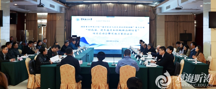 • 本站讯3月25日,国家重点研发计划“海洋农业与淡水渔业科技创新”专项“耐高温、速生扇贝和牡蛎新品种培育”项目(以下简称“项目”)启动会暨实施方案论证会在青岛召开。  中国海洋大学党委常务副书记张静,农业农村部科技发展中心项目管理处处长熊炜出席启动会并致辞。项目咨询专家组由中国海洋大学包振民院士,大连海洋大学宋林生教授,中国科学院海洋研究所张国范研究员、杨红生研究员等7位专家组成,包振民院士任专家组组长。  张静代表项目牵头单位致辞,感谢农业农村部科技发展中心以及各位专家对学校的关心和支持。她表示,学校始终以全方位服务国家海洋强国建设为己任,积极发起并牵头发起“透明海洋”“蓝色粮仓”“蓝色药库”等海洋领域的大科学计划,取得了丰硕的成果。作为牵头单位,将统筹协作,做好服务保障工作,高质量完成项目任务,为打造“蓝色粮仓”,推动海洋经济高质量发展,服务国家粮食安全和海洋强国建设作出积极的贡献。  熊炜对项目立项和启动表示祝贺。他指出,“十三五”以来特别是党的十八大以来,党中央、国务院高度重视科技创新。项目的关键在于开辟新的研究领域,提出新观点、新方法、新理论,同时创新成果要更好更快更有效率地转
