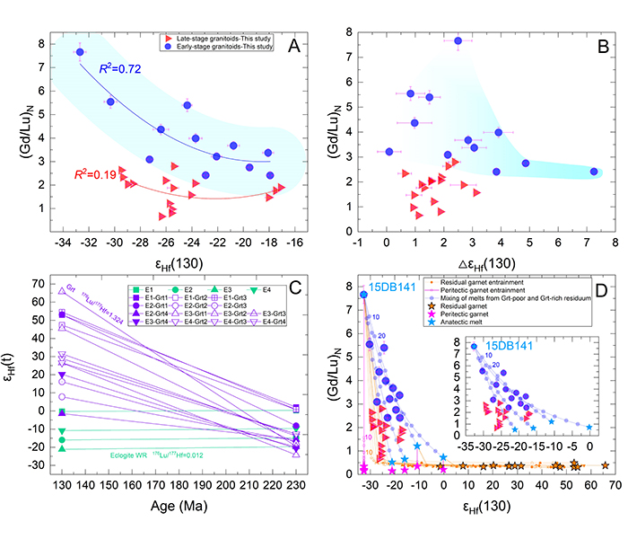 • 本站讯近日,中国海洋大学深海圈层与地球系统前沿科学中心、海底科学与探测技术教育部重点实验室、海洋地球科学学院陈龙副教授与国内国际合作者在国际地学顶尖刊物Geology (地质学)上发表了题为“The garnet effect on hafnium isotope compositions of granitoids during crustal anatexis”(地壳深熔过程中石榴石的Hf同位素效应)的成果。陈龙副教授为论文的第一作者和共同通讯作者。花岗岩放射成因同位素组成是示踪其源区(母岩浆)成分的重要工具,而熔体和残留体(分离结晶相)间的同位素平衡是开展这一示踪的前提。虽然分离结晶时熔体和矿物之间基本上都能达到Hf同位素的平衡,但在地壳深熔时,熔体和残留体之间经常存在Hf同位素的不平衡。在大多数地壳岩石中,锆石是Hf的主要赋存矿物。相对锆石,石榴石具有高得多的Lu/Hf比值和模态丰度,但石榴石Hf对体系Hf的贡献仍远小于锆石Hf。近期的研究工作对锆石在地壳深熔时的行为及其Hf同位素效应有了较为系统的认识,但对石榴石的Hf同位素效应却鲜有研究。很多学者推测石榴石中放射成因Hf的衰