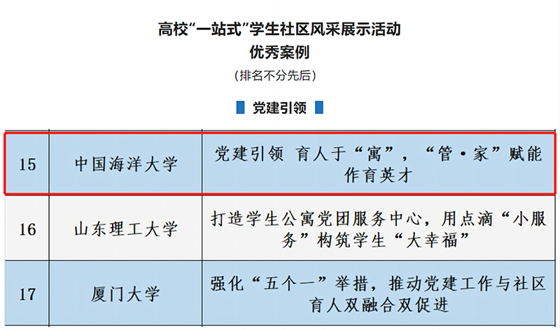 • 本站讯根据《关于开展高校“一站式”学生社区风采展示活动的通知》,经高校推荐、专家评审等环节,中国海洋大学《党建引领育人于“寓”,“管·家”赋能作育英才》成功入选学生社区风采展示活动“党建引领”单元优秀案例。此次高校“一站式”学生社区风采展示活动,由教育部思想政治工作司组织开展,旨在丰富“一站式”学生社区综合管理模式建设内涵,充分展示高校学生社区作为学生党建前沿阵地、“三全育人”实践园地、平安校园样板高地的育人成效,最终遴选出120项优秀案例纳入全国高校思想政治工作网资源库,并在“一站式”学生社区综合管理模式建设工作云平台进行集中展示,山东省共有4个高校的案例入选。高校“一站式”学生社区风采展示活动“党建引领”单元优秀案例“一站式”学生社区综合管理模式建设试点工作是2020年《教育部等八部门关于加快构建高校思想政治工作体系的意见》中明确的重点任务,是适应新形势新情况、加强高校党的建设和思想政治工作的重要体制机制创新。中国海洋大学积极贯彻教育部“一站式”学生社区综合管理模式建设试点工作部署要求,立足学校基础和优势,主动探索建设体现思政要求、贴近学生实际的“一站式”学生社区综合管理模式,并于