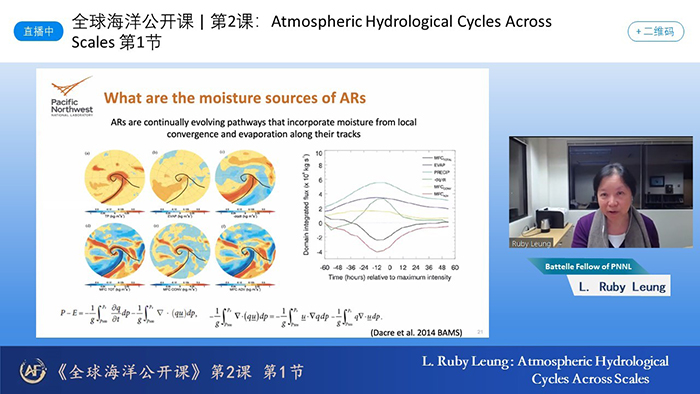 本站讯11月15至18日,美国国家工程院院士、美国AAAS, AGU和 AMS 会士、美国西北太平洋国家实验室国际著名气象学家L. Ruby Leung博士应邀主讲“全球海洋公开课”,与未来海洋学院导师宋丰飞教授联合讲授“Atmospheric Hydrological Cycles Across Scales”(多尺度的大气水循环变化)系列课程。未来海洋学院院长李建平主持开课仪式并致辞。李建平在致辞中对L. Ruby Leung院士受邀授课表示感谢,他强调,党的二十大报告指出“着力造就拔尖创新人才”,未来海洋学院邀请世界顶尖科学家做客“全球海洋公开课”,提升海洋交叉拔尖人才培养质量,就是以实际行动贯彻落实党的二十大精神。未来海洋学院将以建设世界一流海洋学院为目标,培养造就学科交叉的创新性、复合型高层次顶尖人才,为海洋强国和人才强国建设贡献力量。Leung院士和宋丰飞教授在“跨尺度大气水循环”课程的联合讲授过程中,放眼大尺度和中尺度的大气水循,着重介绍了大气河与急流、季风与热带辐合带、中尺度对流系统等重要天气系统的气候学特征和在全球变暖背景下的变化趋势。Leung院士首先关注中纬度大气